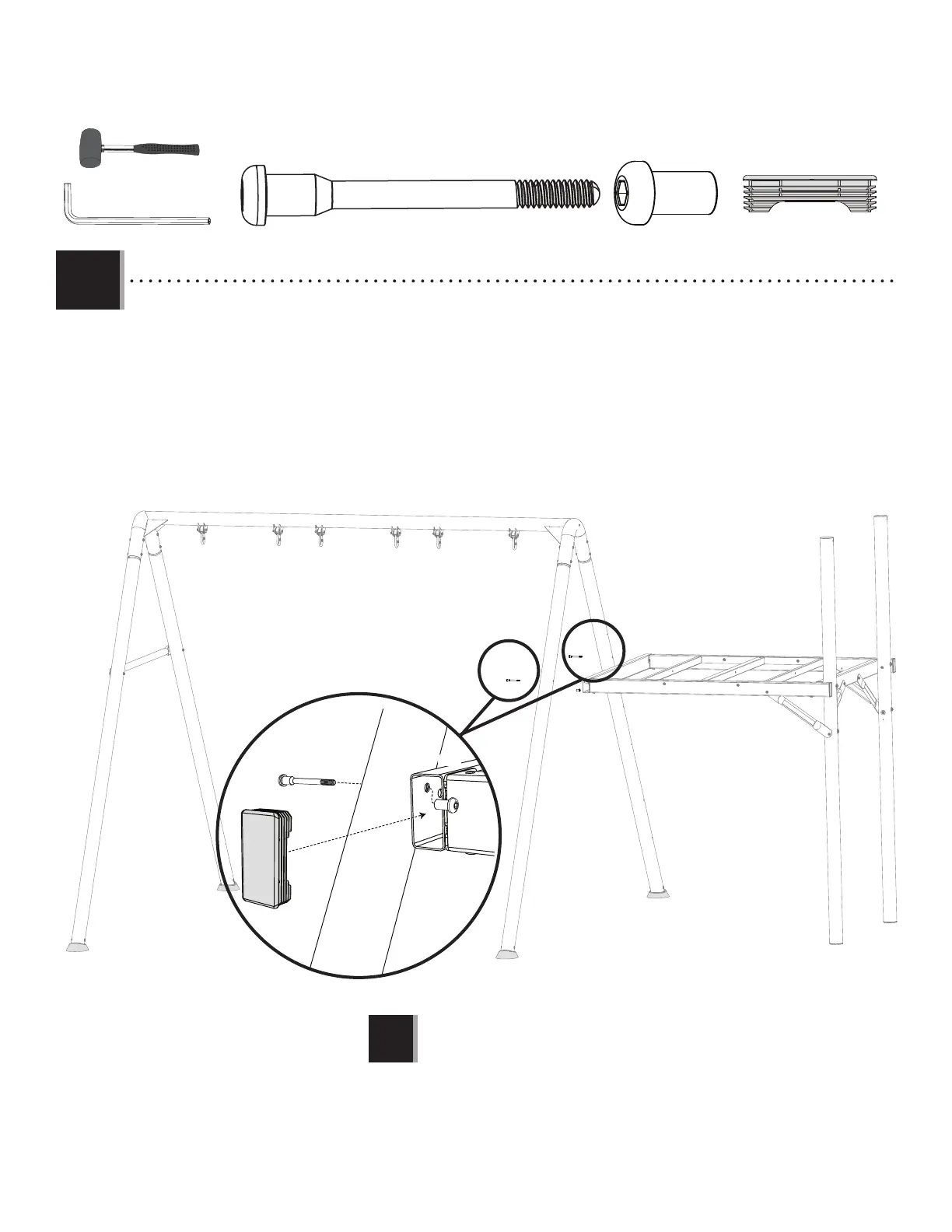 • Attach the deck support assembly to the A-frame assembly using the hardware indicated. Insert a rectangular