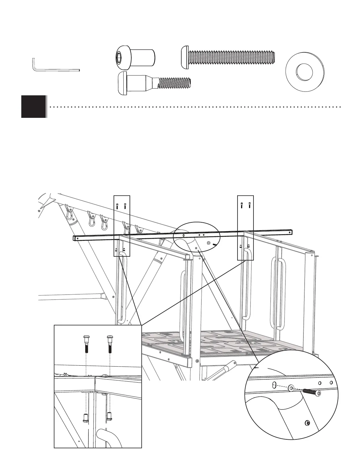• Attach the A-frame roof tube (CBV) to the one-handle rails (CBS) and the swing bar (CBO) with the hardware shown in the