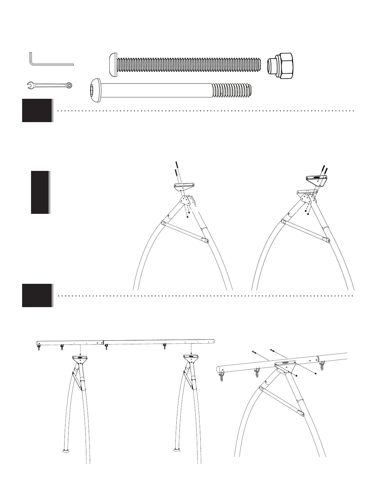 • Attach the Swing Bar Assembly to the Frame Pole Assemblies as shown with the hardware indicated.