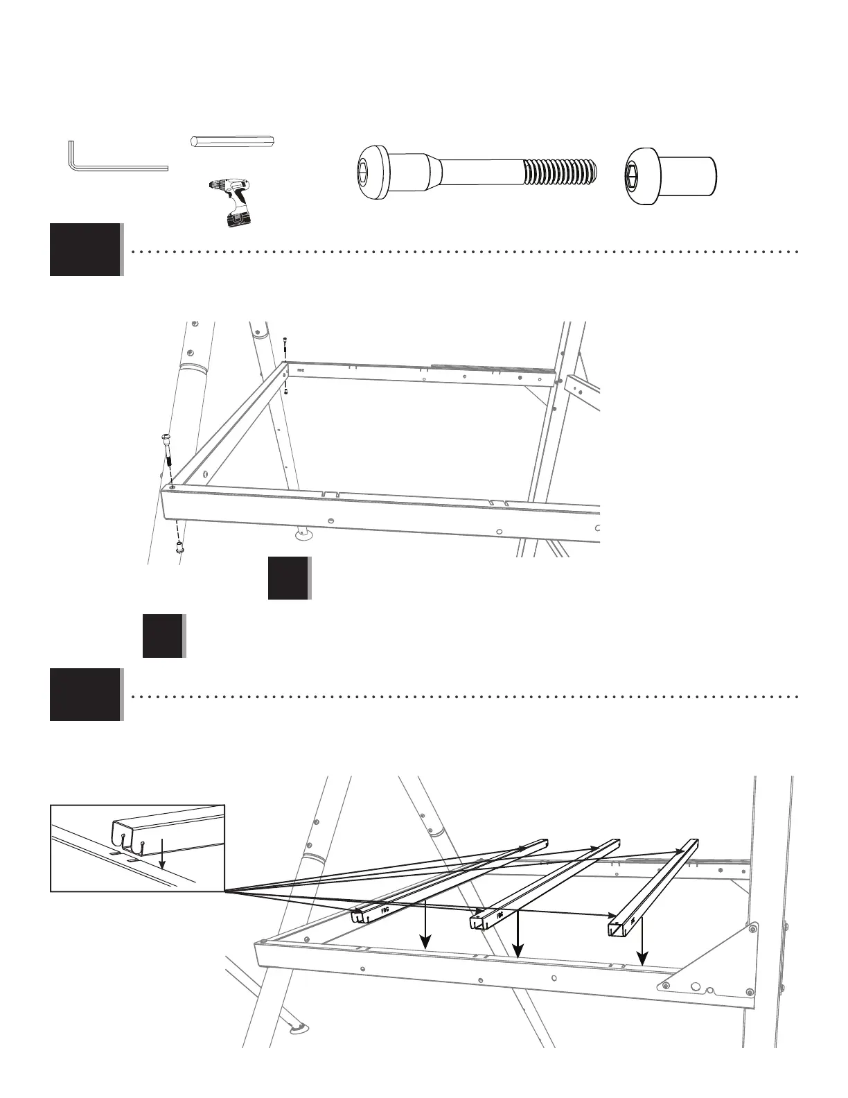 • Attach the Large Deck Frame to the A-Frame with the hardware indicated.