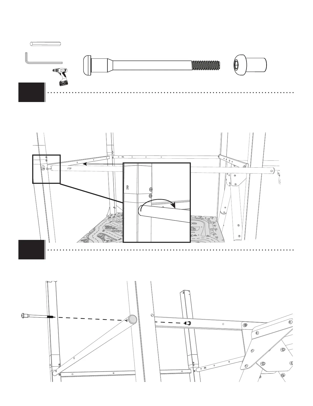 • Asegure el extremo opuesto de la barandilla de la cubierta (lado de la resbaladilla) (FTP) con los elementos