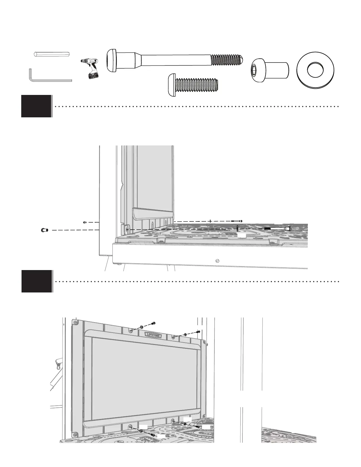 • Attach the bottom outer edges of the Large Activity Wall (FRJ) to the Main Deck Pole (FUO) with the hardware indicated.