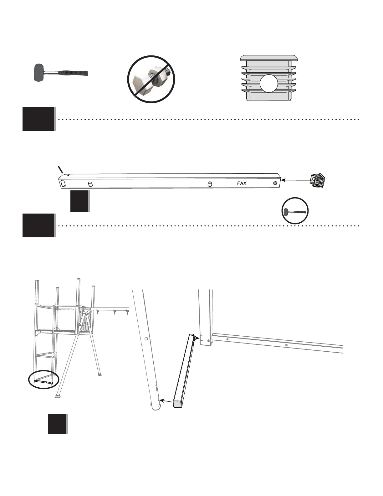 • Insert the Panel Support Pole (FAX) into the Deck Frame with the Plugged end inside the frame. Slide the Locking Tabs