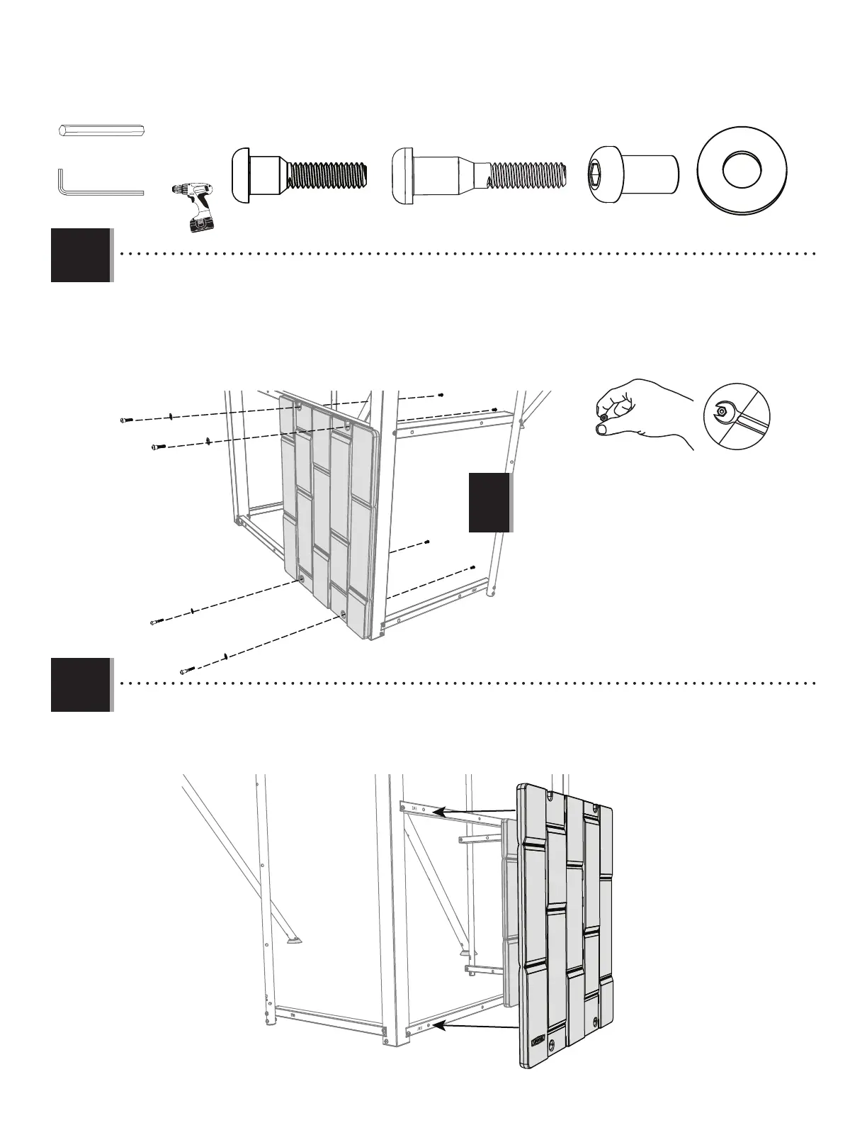 • Attach the Lower Deck Storefront Wall (FJC) to the Long Panel Support Poles (FAT) with the hardware indicated.