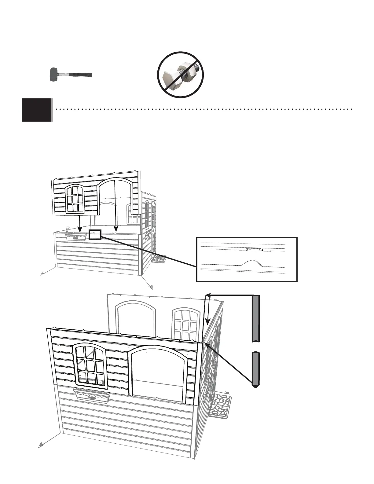 • Place an upper window and door wall panel (GHB) over the left-hand lower wall panel (GHA) and line up the tabs and slots along the
