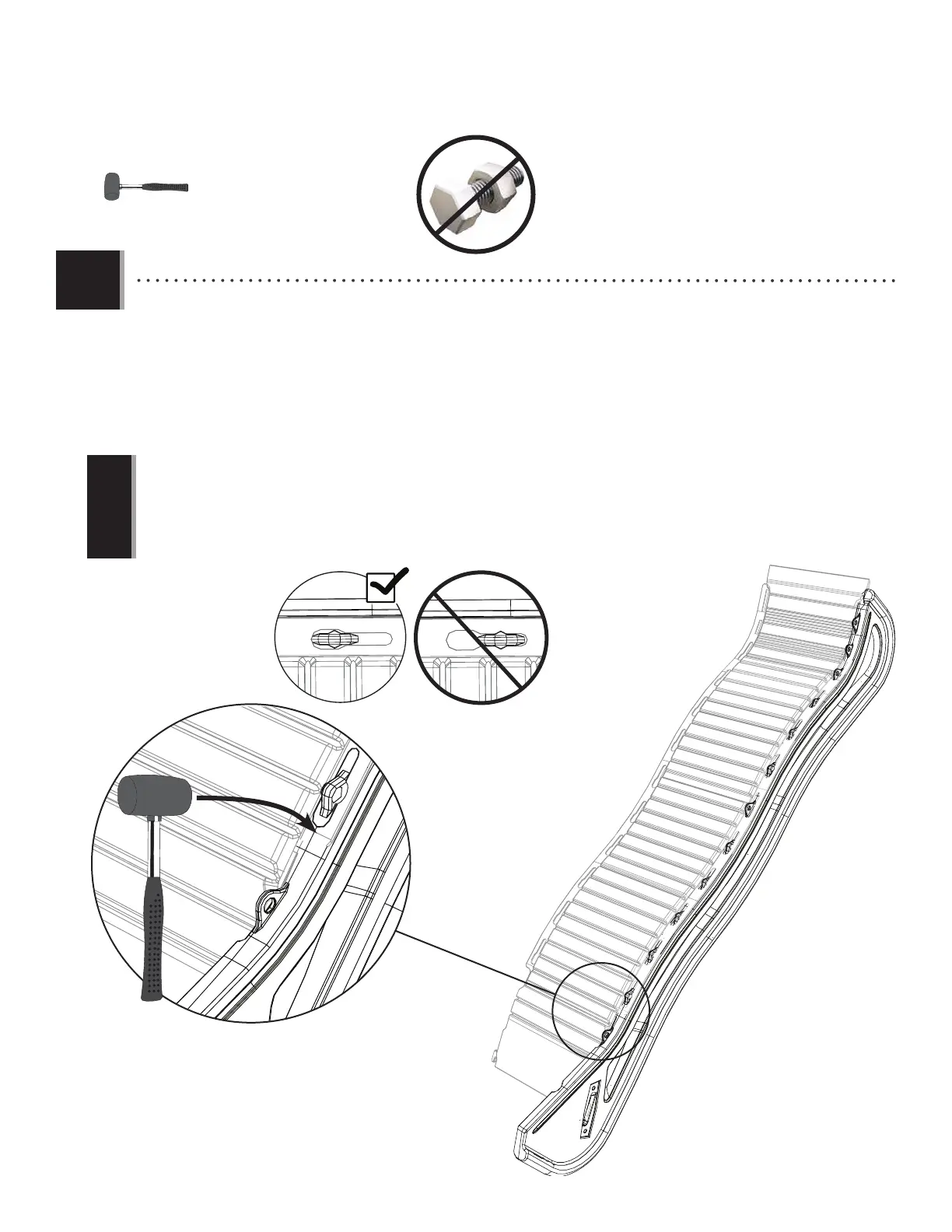restantes. Si nécessaire, frappez l’extrémité opposée de la Rampe jusqu’à ce que les languettes soient positionnées dans les fentes comme illustré.