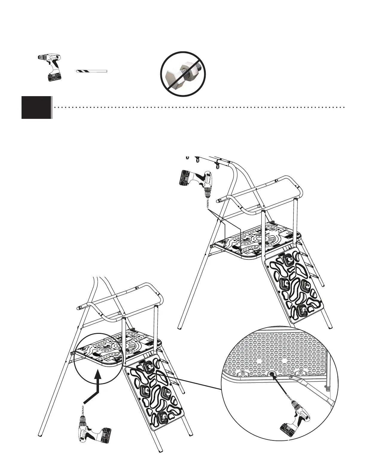 • Use a 3/8 in (≈10 mm) drill bit in the locations indicated. The two outside holes should be drilled from the top