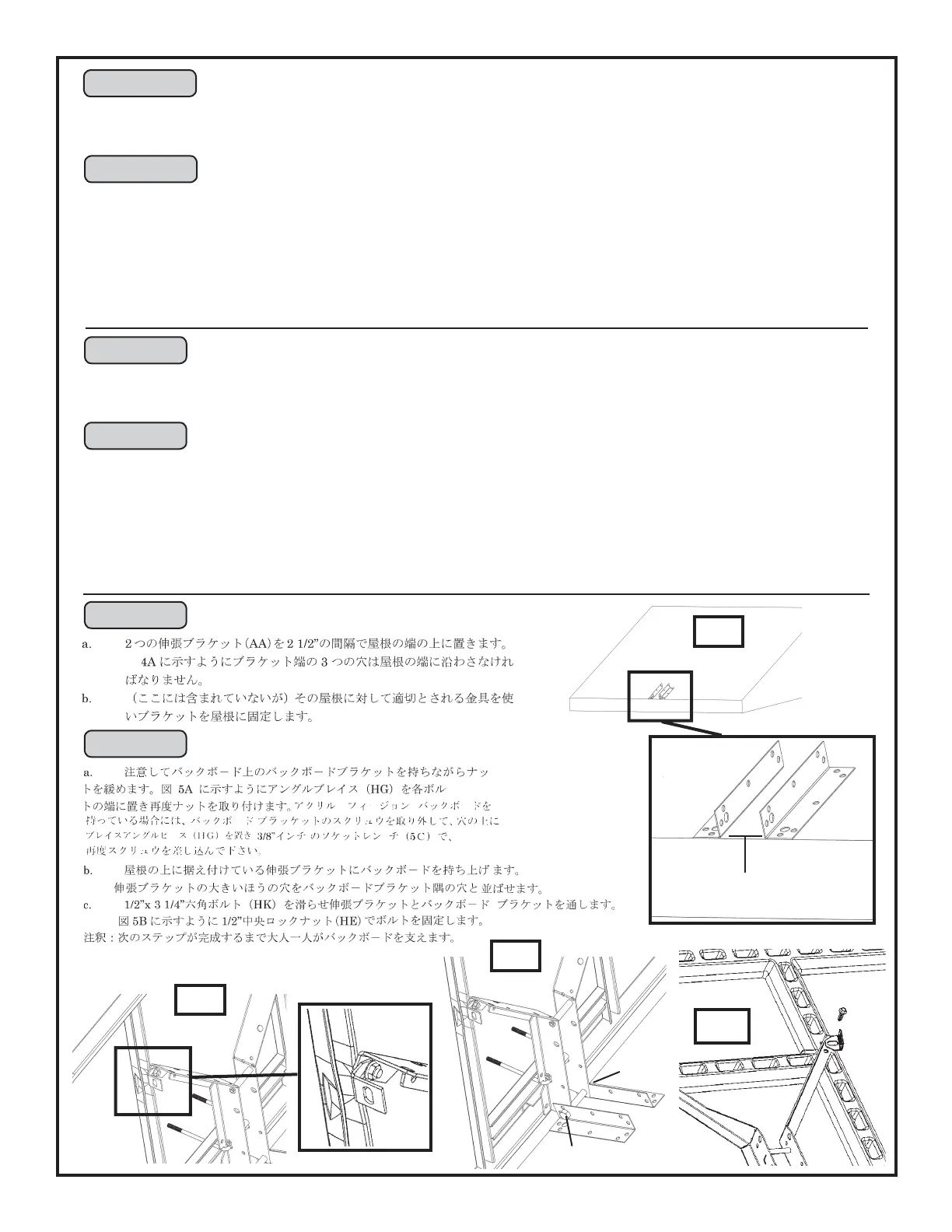 c. Coloque un Bulón de Cabeza Hexagonal de 12,7 x 82,5 mm (1/2” x 3 1/4”) (HK) uniendo los Soportes de Extensión y los Soportes del Tablero. Asegure el Bulón
