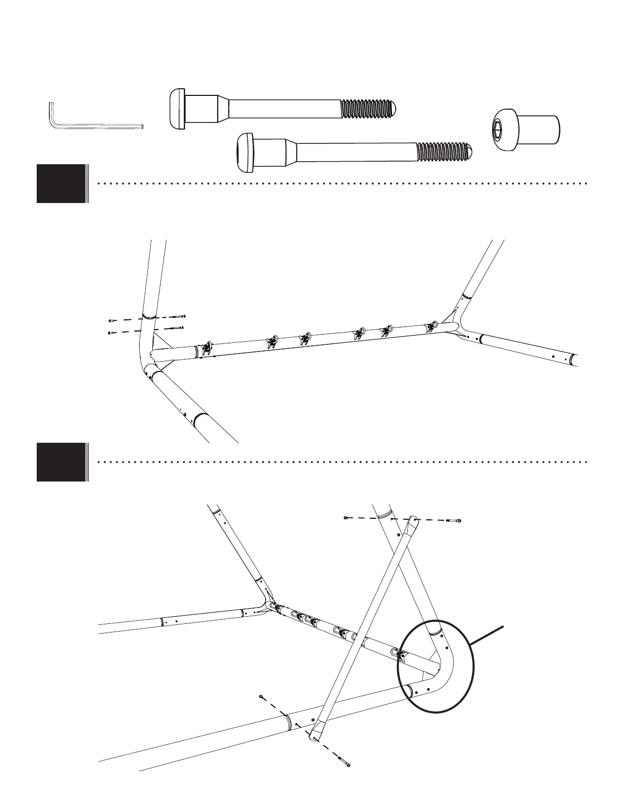 • Attach the second inside A-frame pole assembly into the swing bar with the hardware indicated.