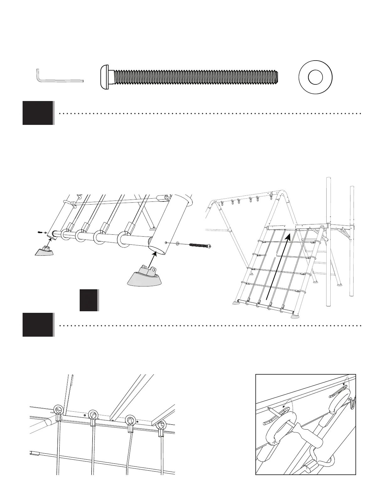 capuchons de pattes en angle comme montré. Attachez les boucles supérieures du fi let à grimper aux crochets
