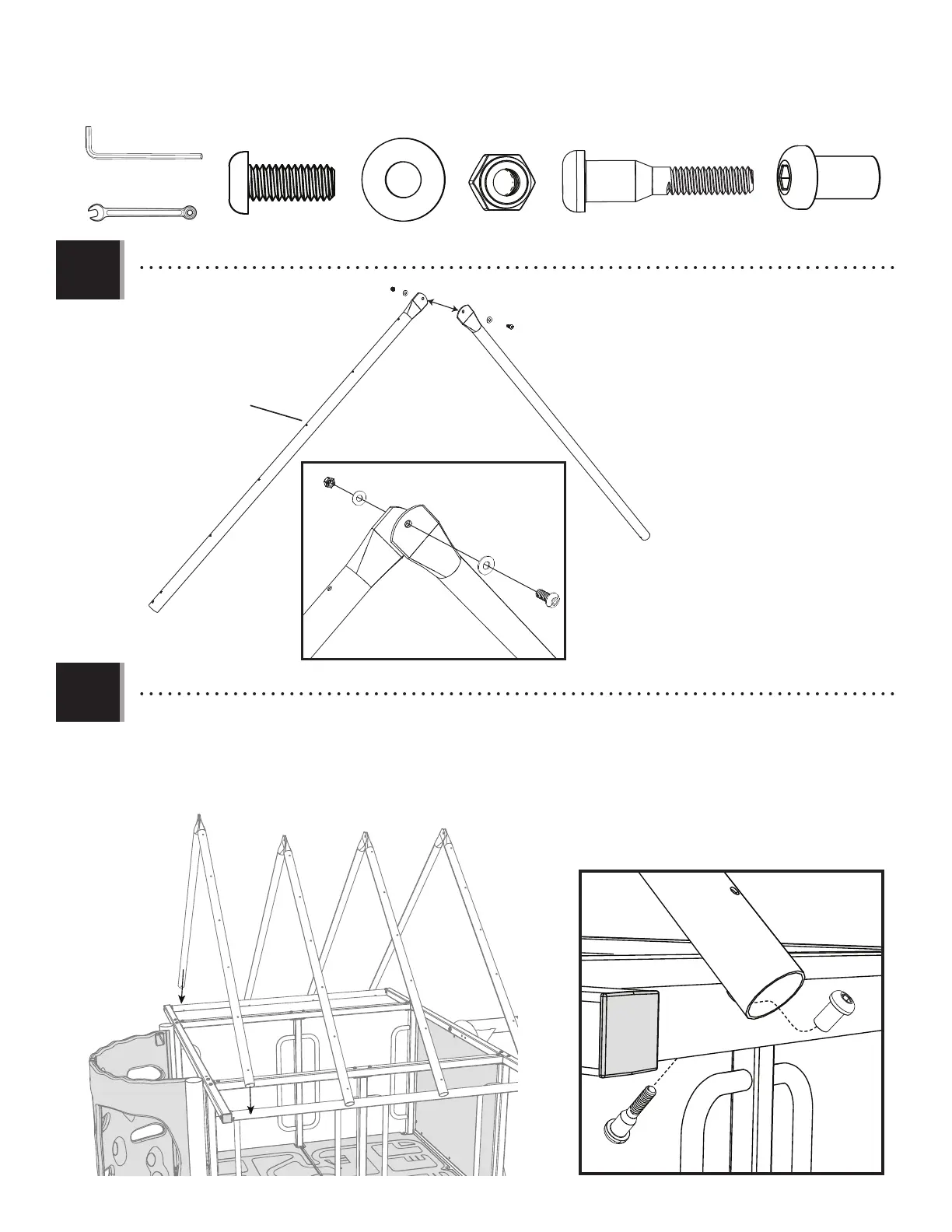 • Place the roof trusses assembled in step 5.2 on the round roof tubes (CCA) as shown and secure with the hardware
