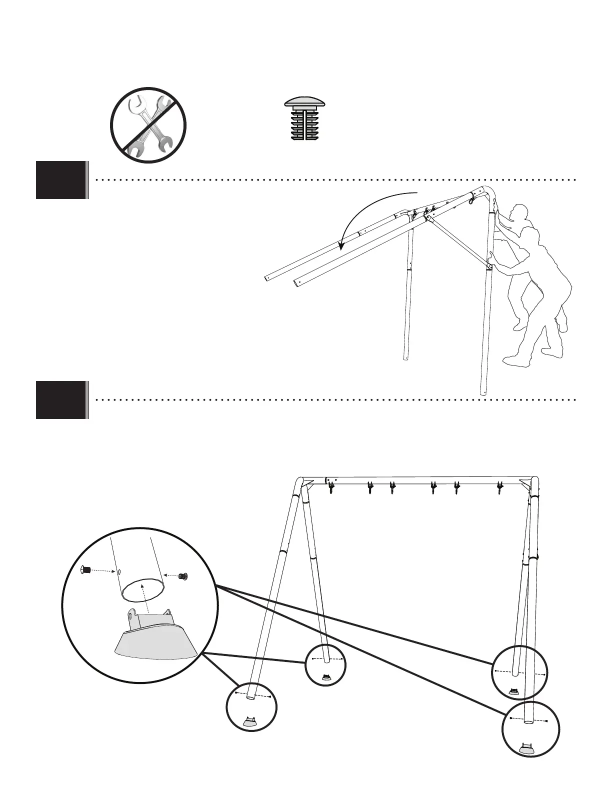 • Have one person hold the A-frame assembly steady as another lifts each leg. Attach the A-frame foot caps (BZJ)