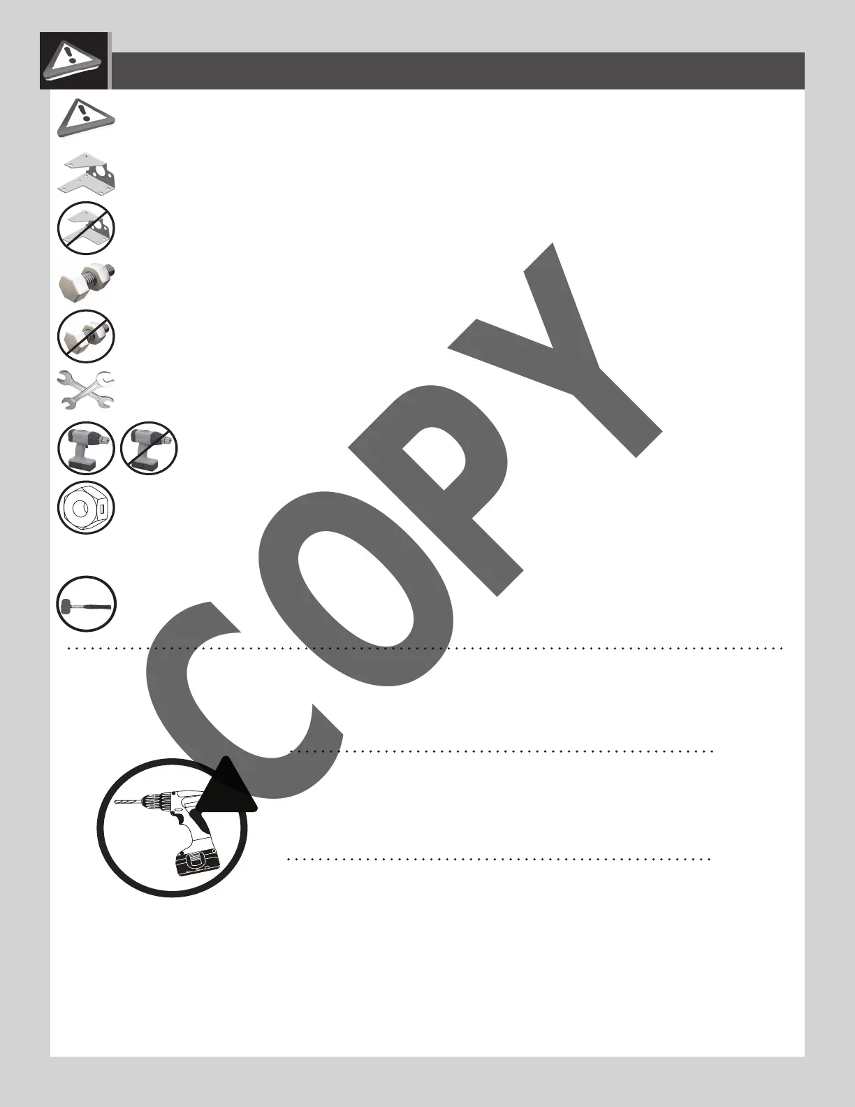• Indicates to use/not to use an electric drill for a specifi c step.
