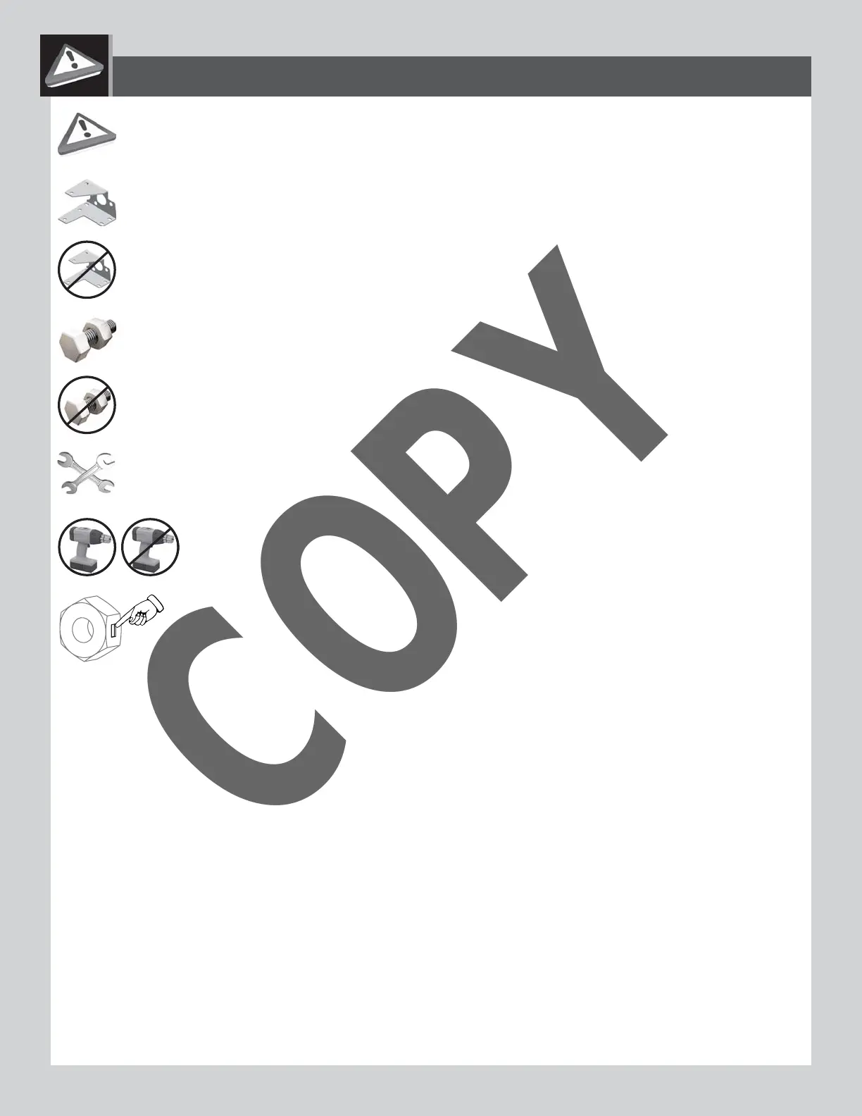 • Indicates to use/not to use an electric drill for a specifi c step.