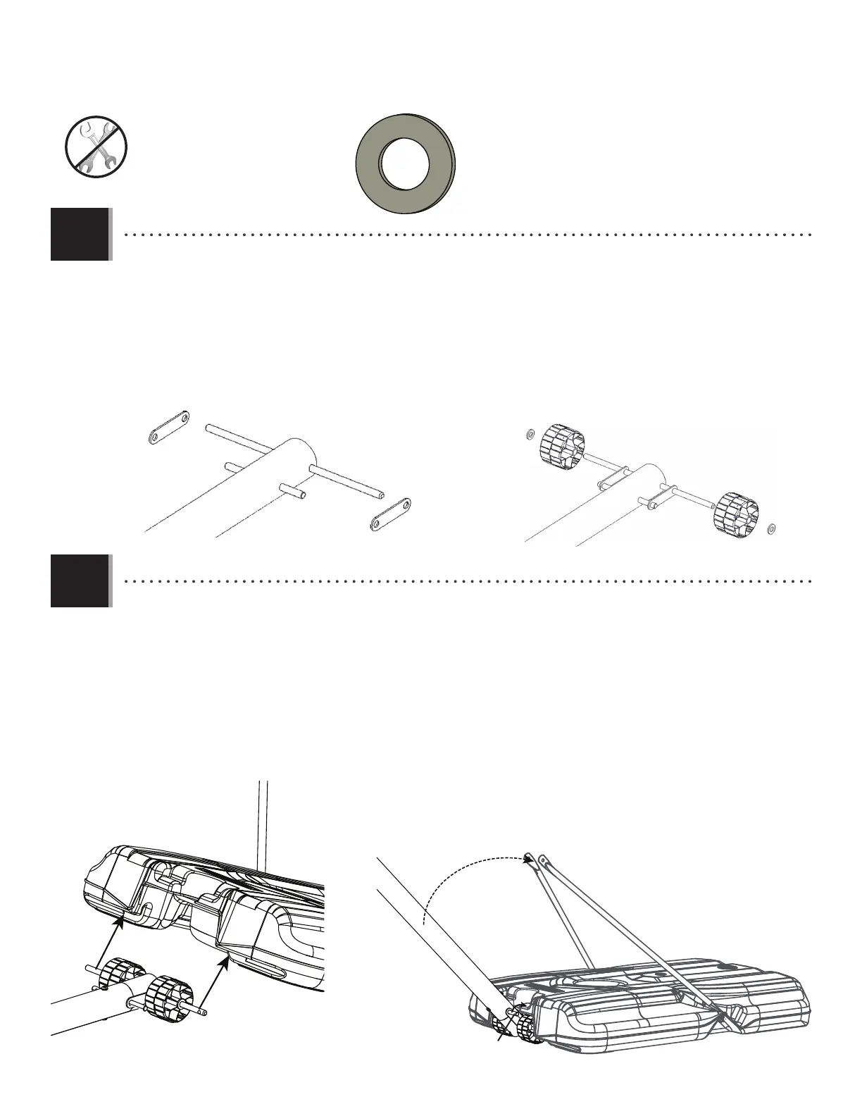 • Slide the Large Axle (AJC) through the Wheels (AMU) and the holes at the end of the Bottom Pole (ALE) as shown. Slide the
