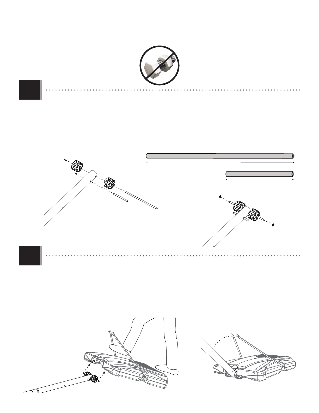 • Slide the large axle (AJC) through the wheels (AMU) and the holes at the end of the bottom pole (ALE) as shown. Slide the small