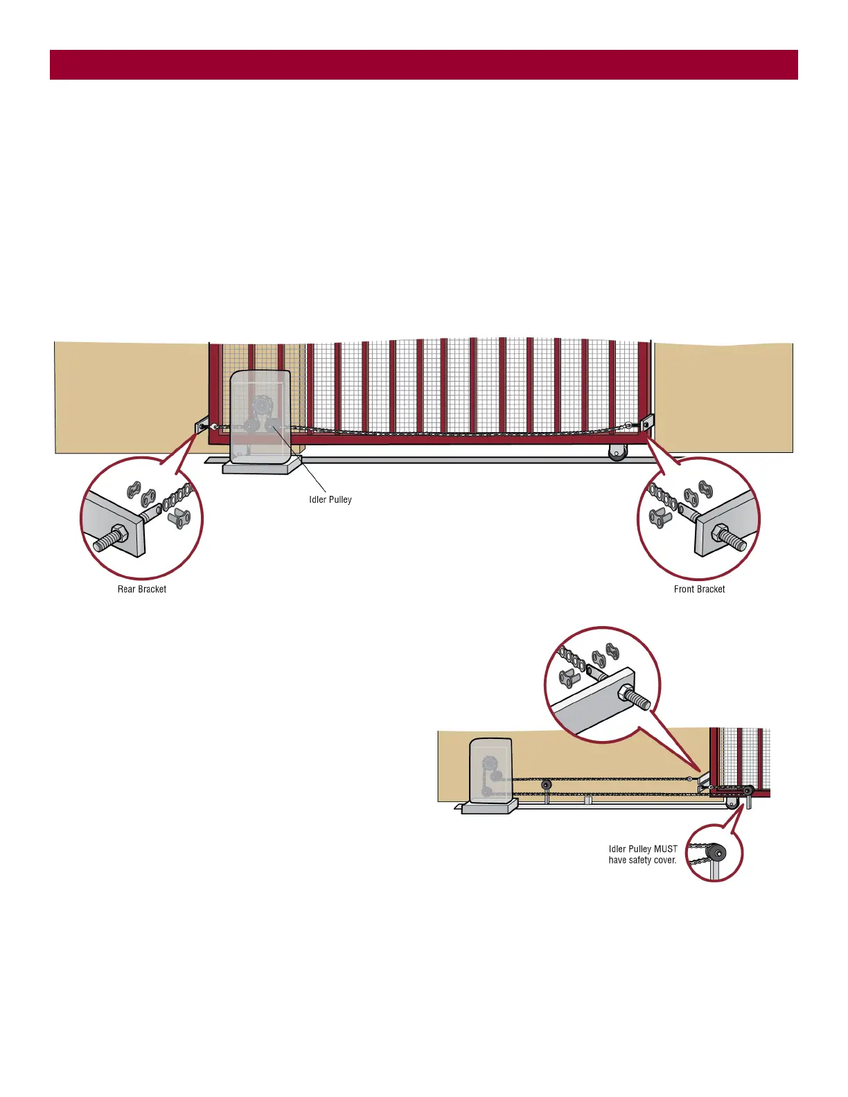 1. Manually open the gate and line up the front bracket so the chain will be level with the idler pulley and parallel to the ground. Weld the front bracket in