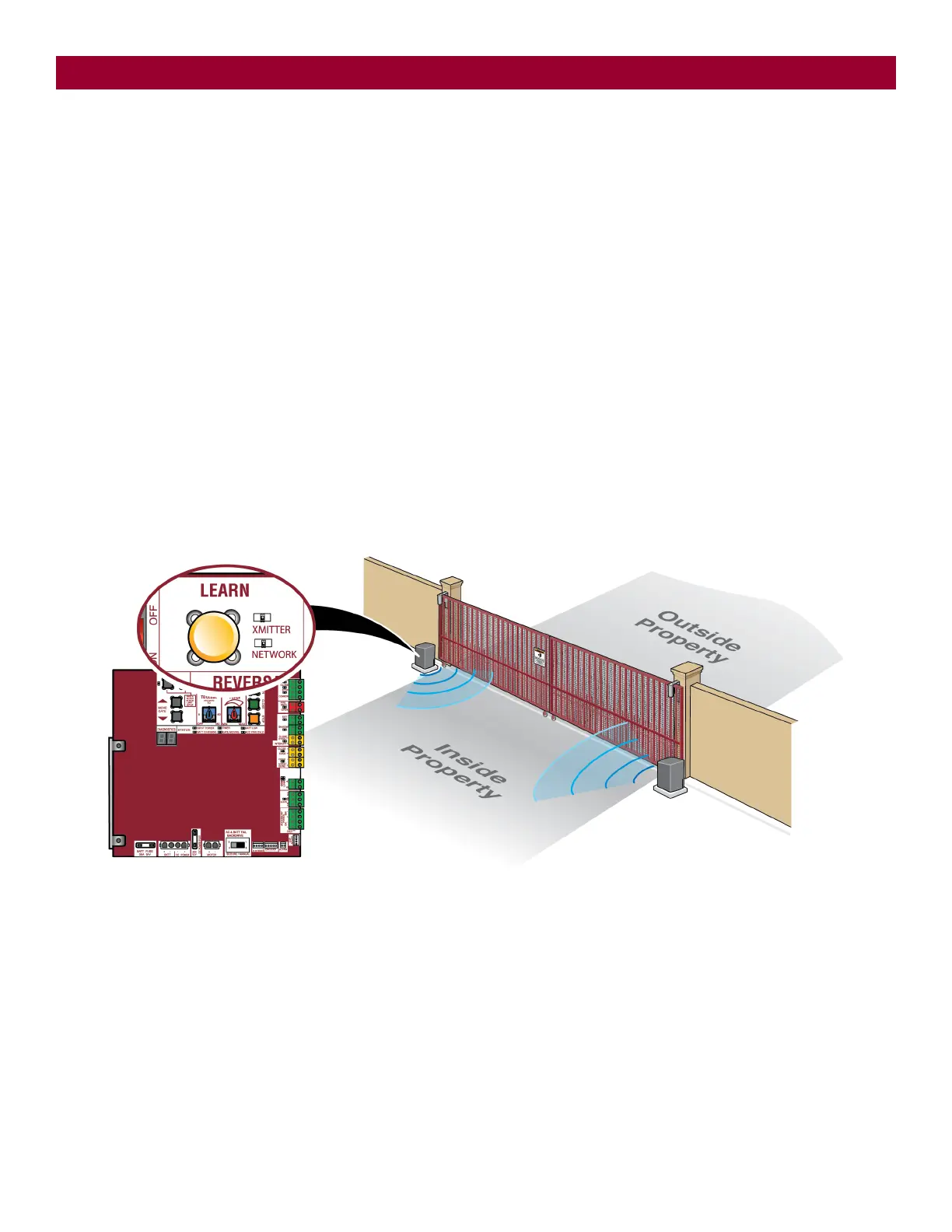1. Press and release the LEARN button on either operator. The green XMITTER LED will light.