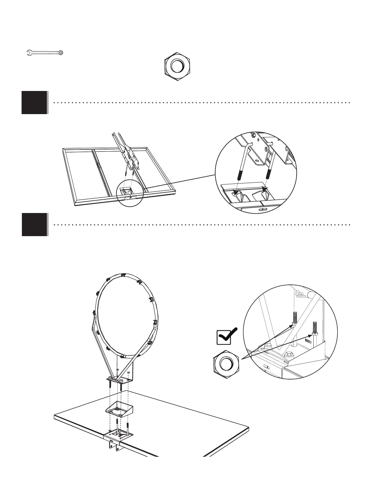 • Connect the Rim (ALX) and Plastic Guard (ALD) to the Backboard (AJI) with the hardware indicated. Thread the Jam Nuts (AAV)