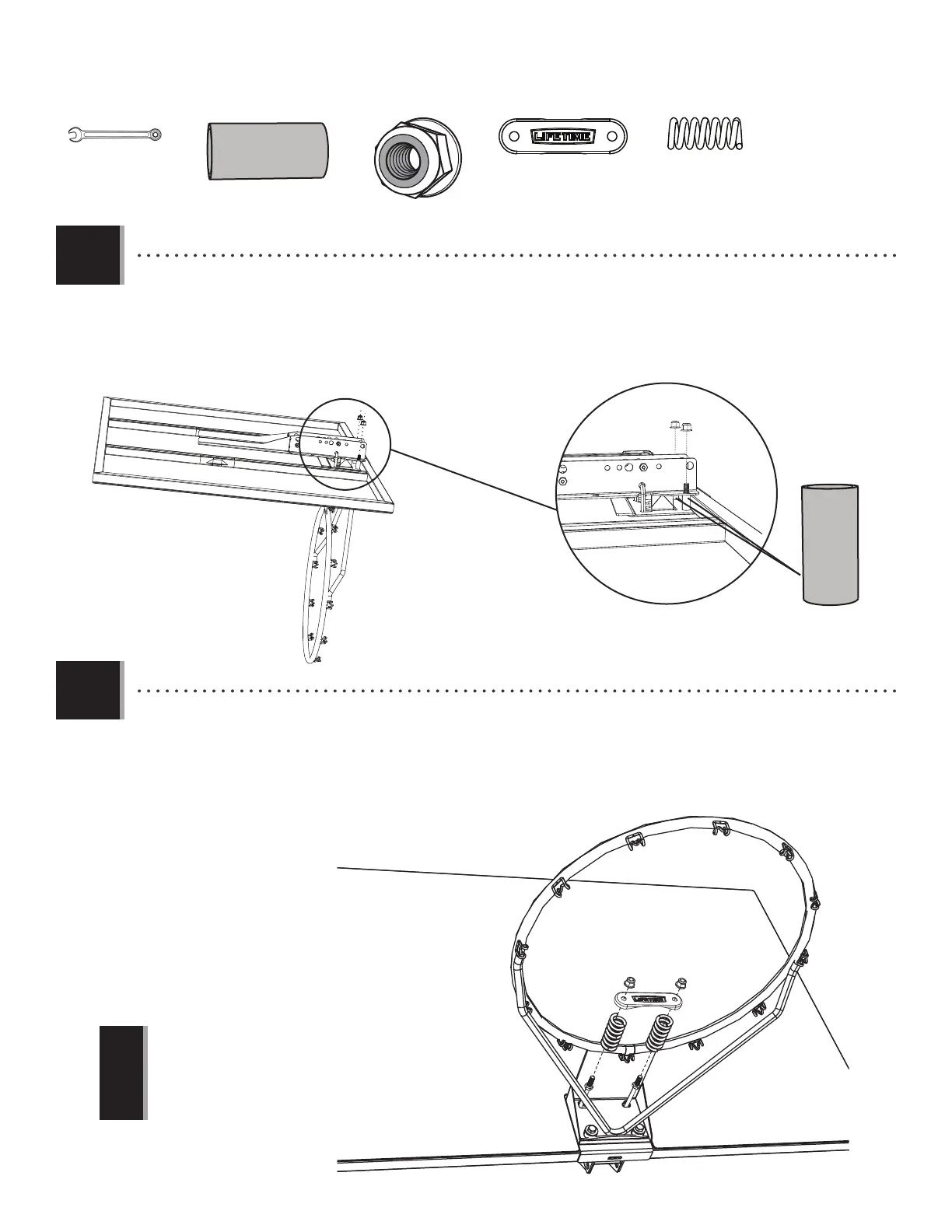 • On the underside of the Backboard, place Steel Spacers (ACS) onto the Bolts (ABG), and secure the Nylock Flange Nuts