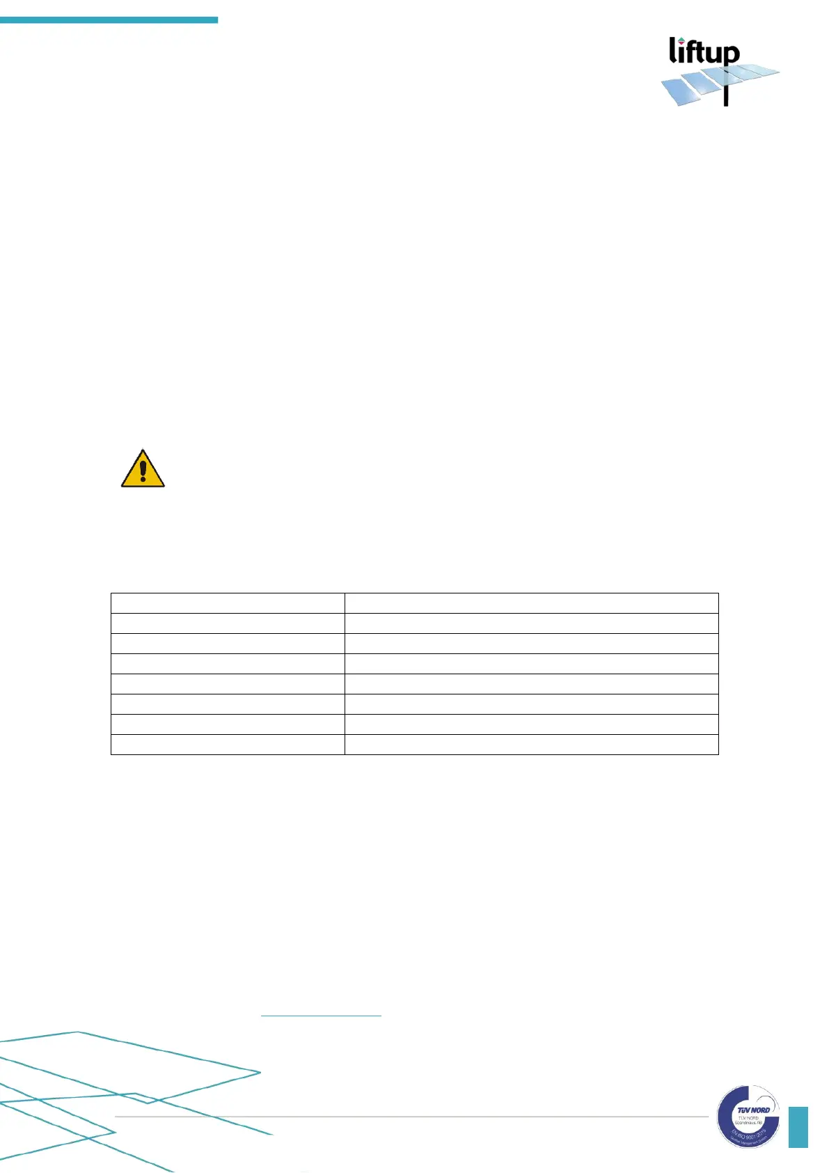 Liftup A/S Hagensvej 21 | DK-9530 Støvring | Danmark | T: +45 96 86 30 20 | M: support@liftup.dk | www.liftup.dk | CVR: DK-1015 3964