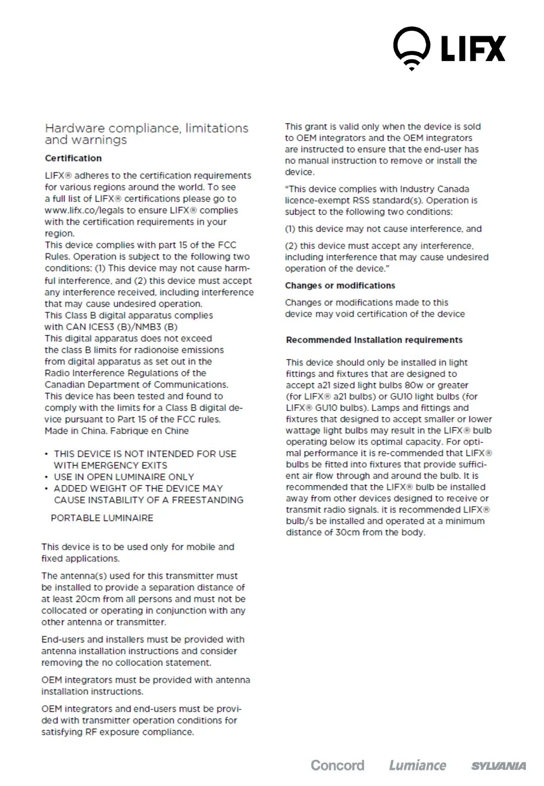LIFX A21 - Warnings and Cautions; Hardware Compliance and Certifications; Usage Restrictions and Safety; Recommended Installation Practices