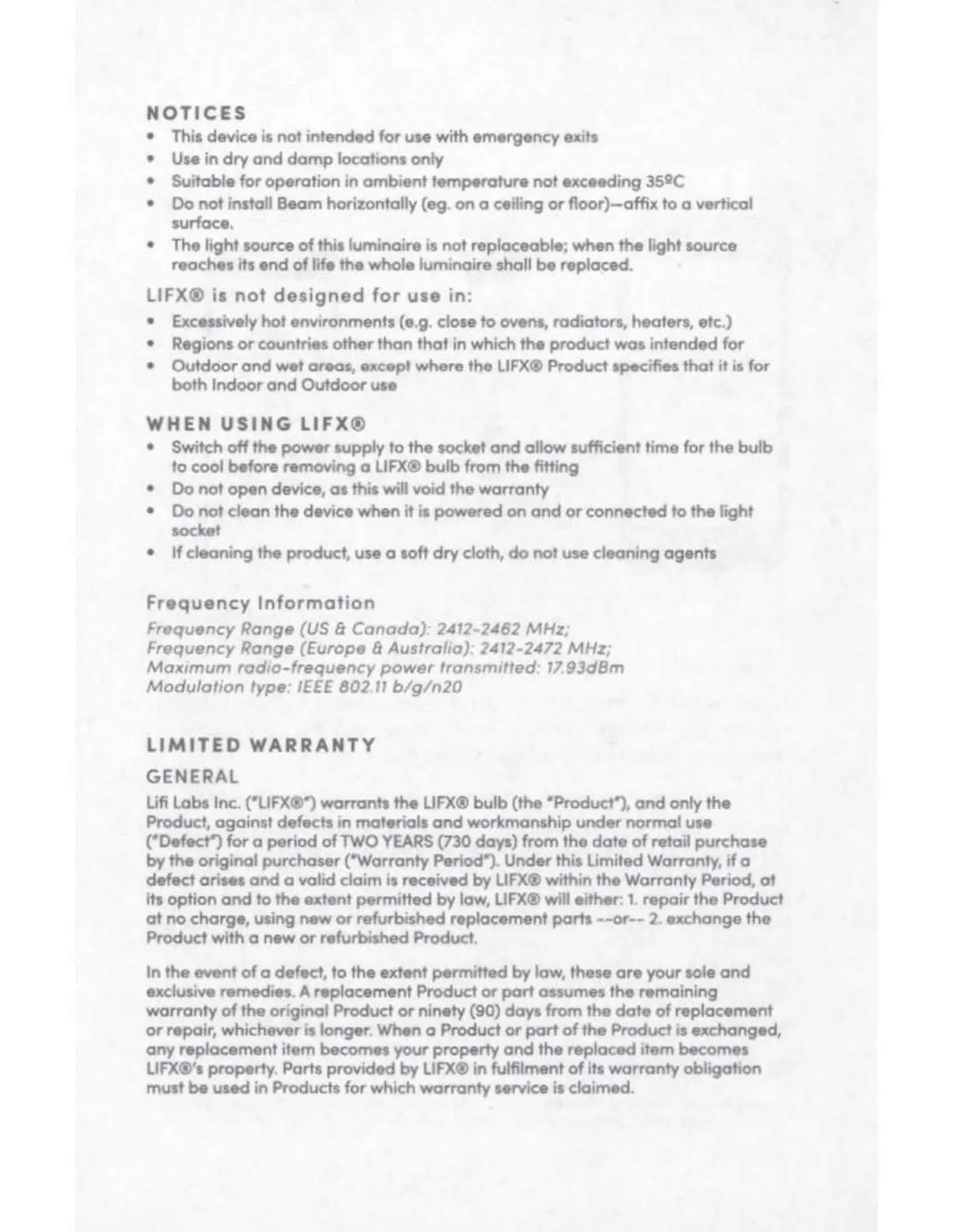 Lifi Labs Inc. c•uFX®") warrants the LIFX® bulb (the