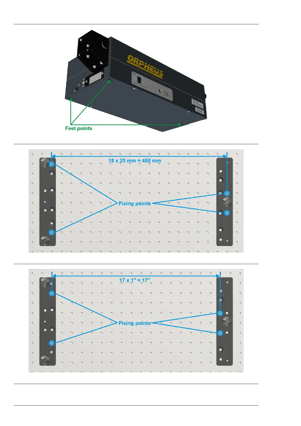 Figure 6. Positioning the feet of ORPHEUS on the optical table (SI system)