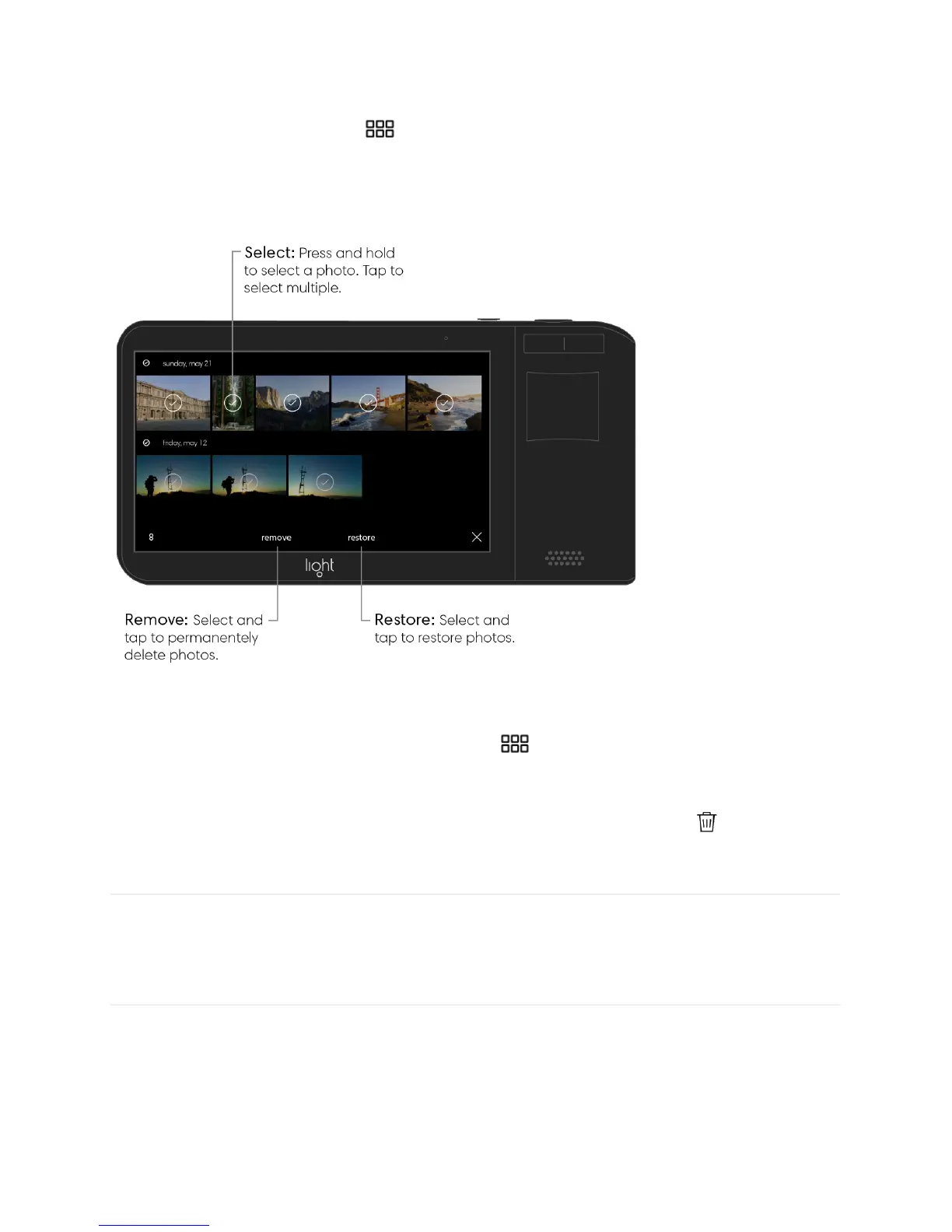 Permanently deleted photos. Tap the grid icon to see all of your photos, then tap “all”