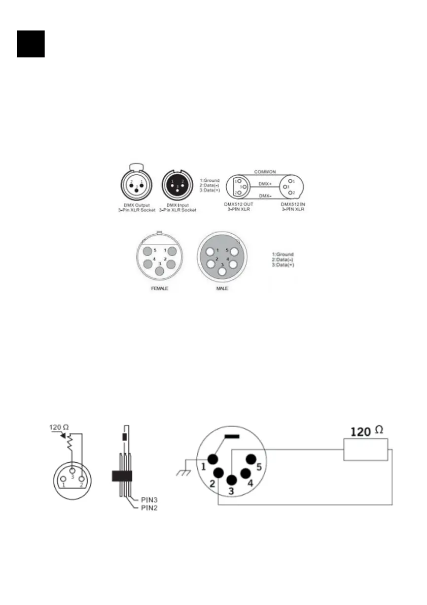 plugged into the output XLR socket of the last fixture in the chain. Please see illustrations be-
