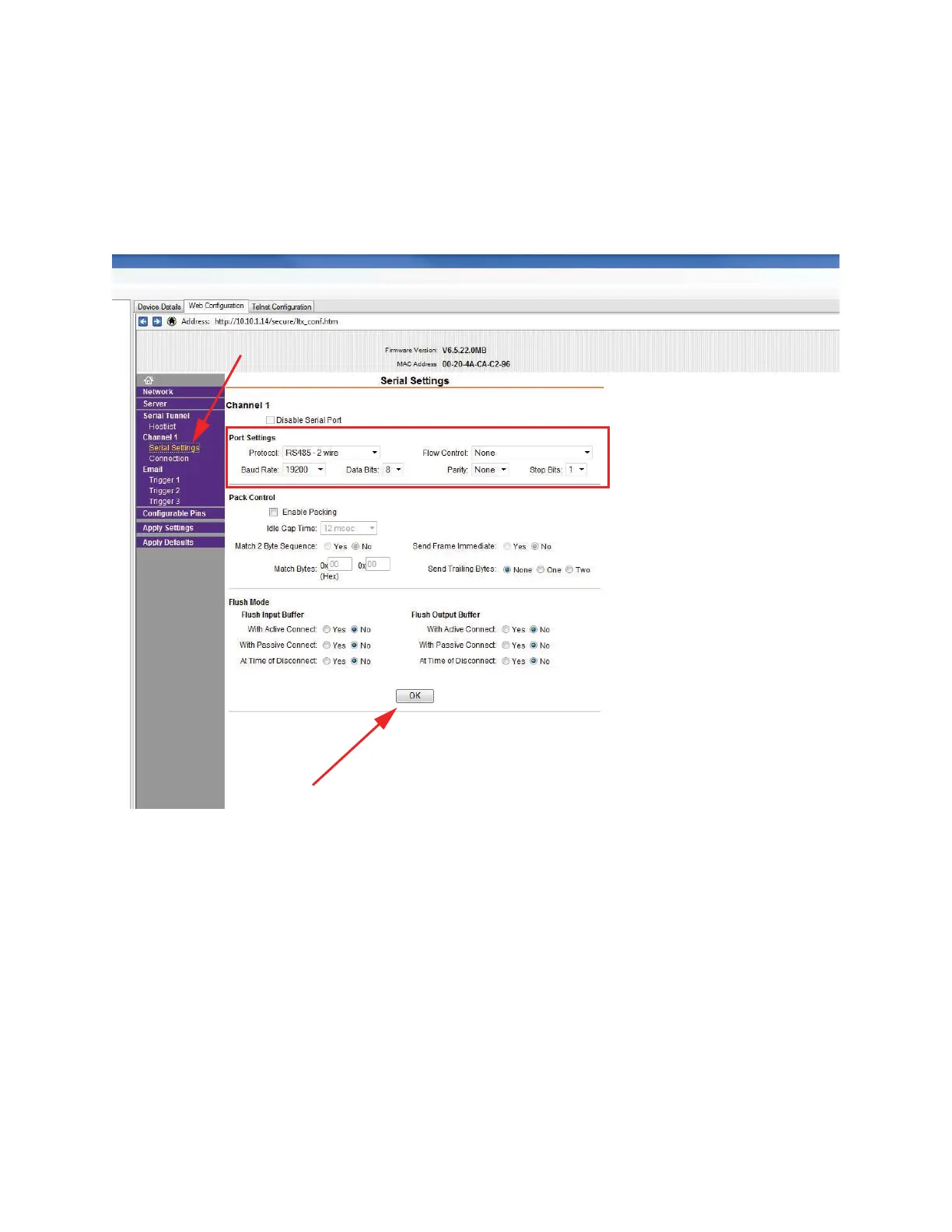Press the OK button to save the settings. Serial Settings will display