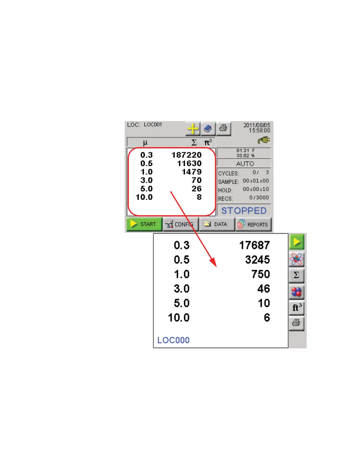 Tap anywhere in the Particle Data area to display the Zoomed Data