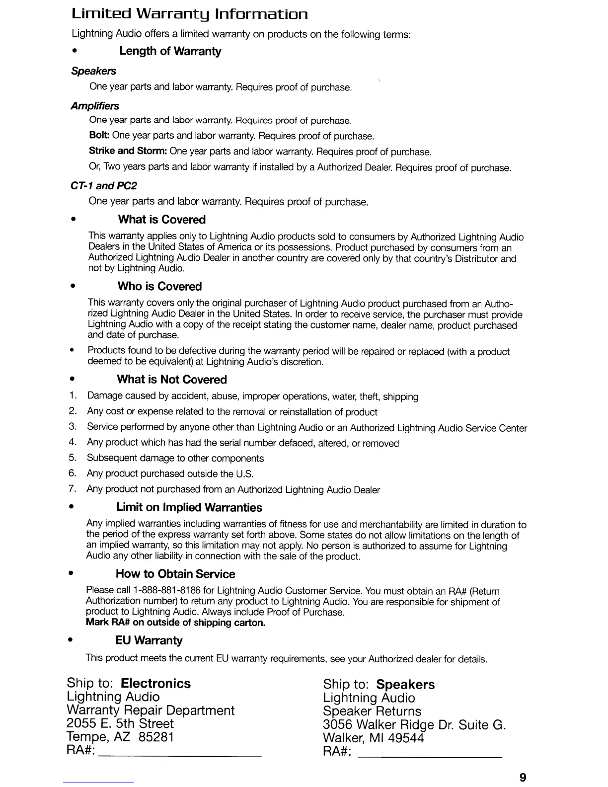 This warranty applies only to Lightning Audio products sold to consumers by Authorized Lightning Audio