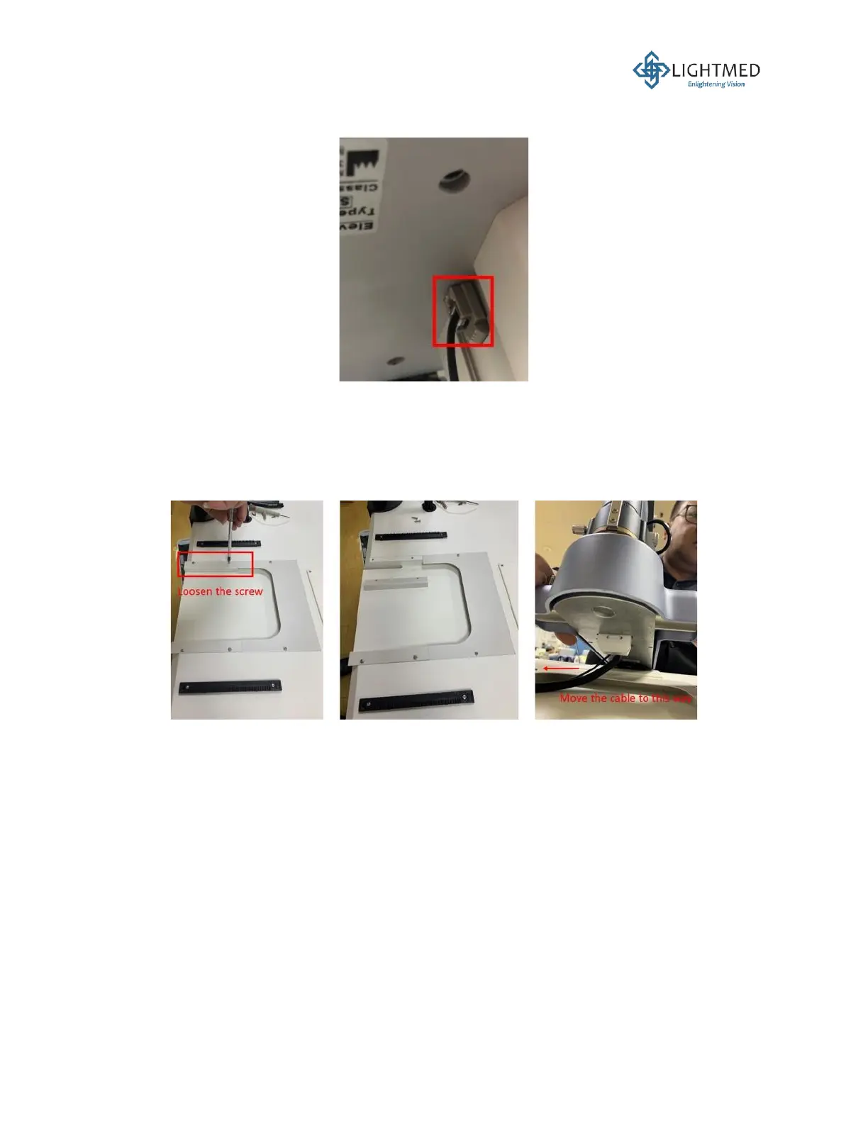 cover plate closest to the table column). Lift the slit lamp and make sure to carefully route the