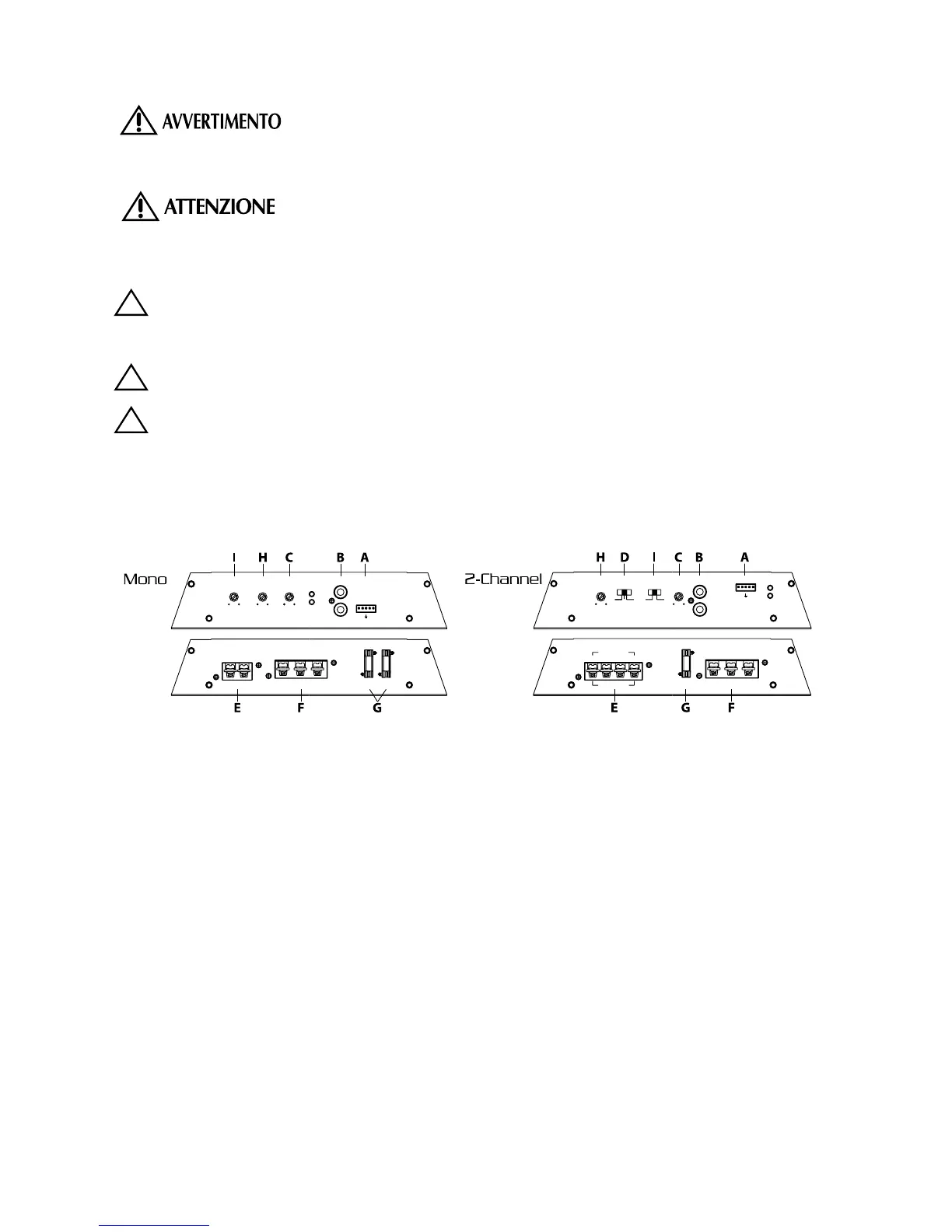 Collegamenti per altoparlanti: Seguite la polarità corretta e non collegate a massa nessuno dei fili