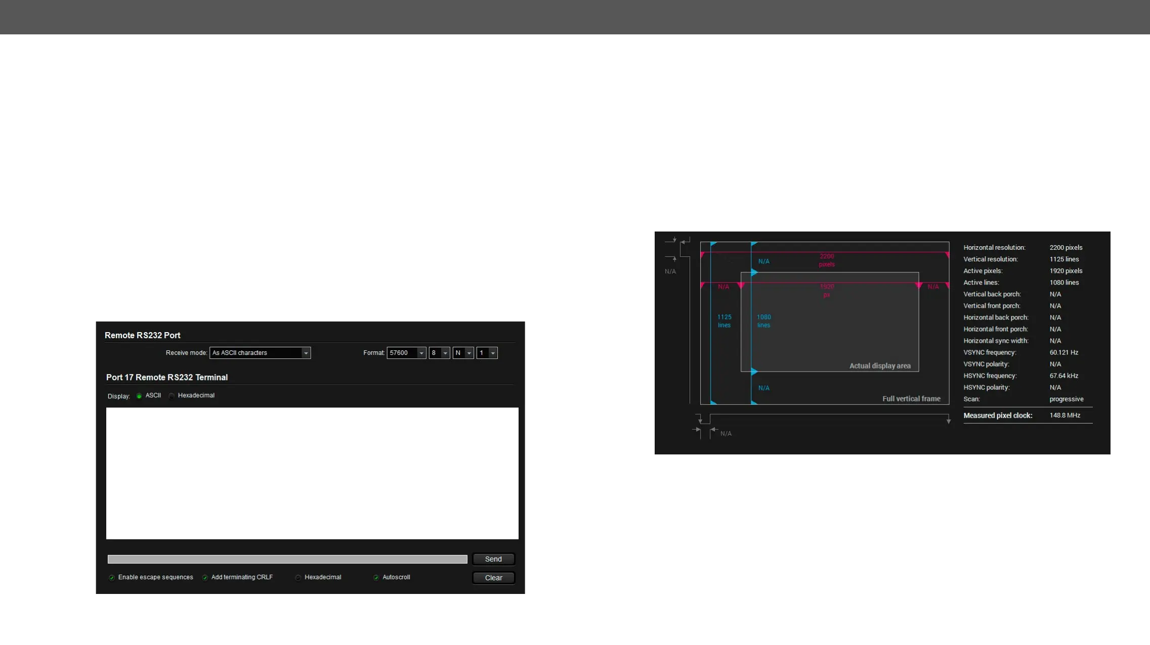 The RS-232 commands can be sent via this terminal or protocol commands (for protocol commands see the