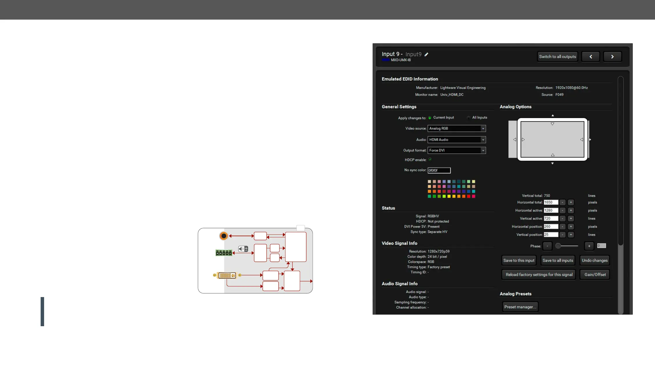The output signal type can be selected (DVI or HDMI mode) which is sent towards the matrix crosspoint.