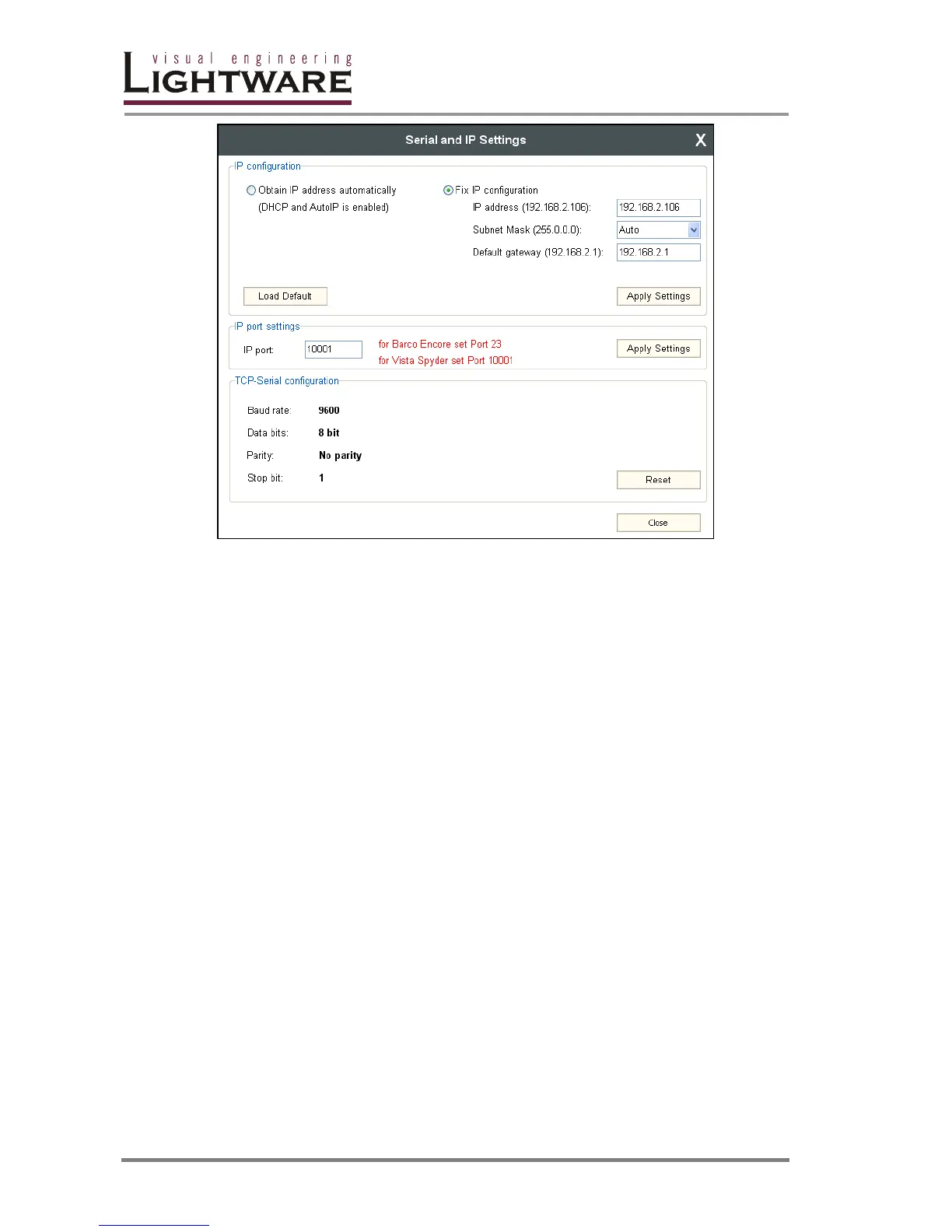 Info: The “Load Default” button loads the factory default IP settings to the fields, which