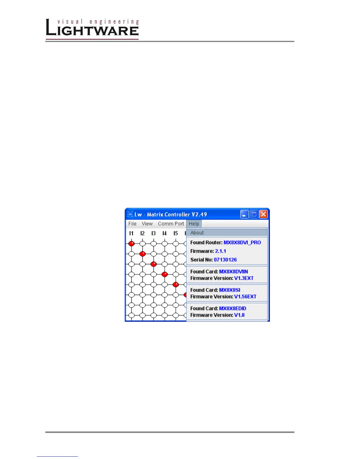 The connected matrix router’s name (MX8x8DVI_PRO), installed firmware revision