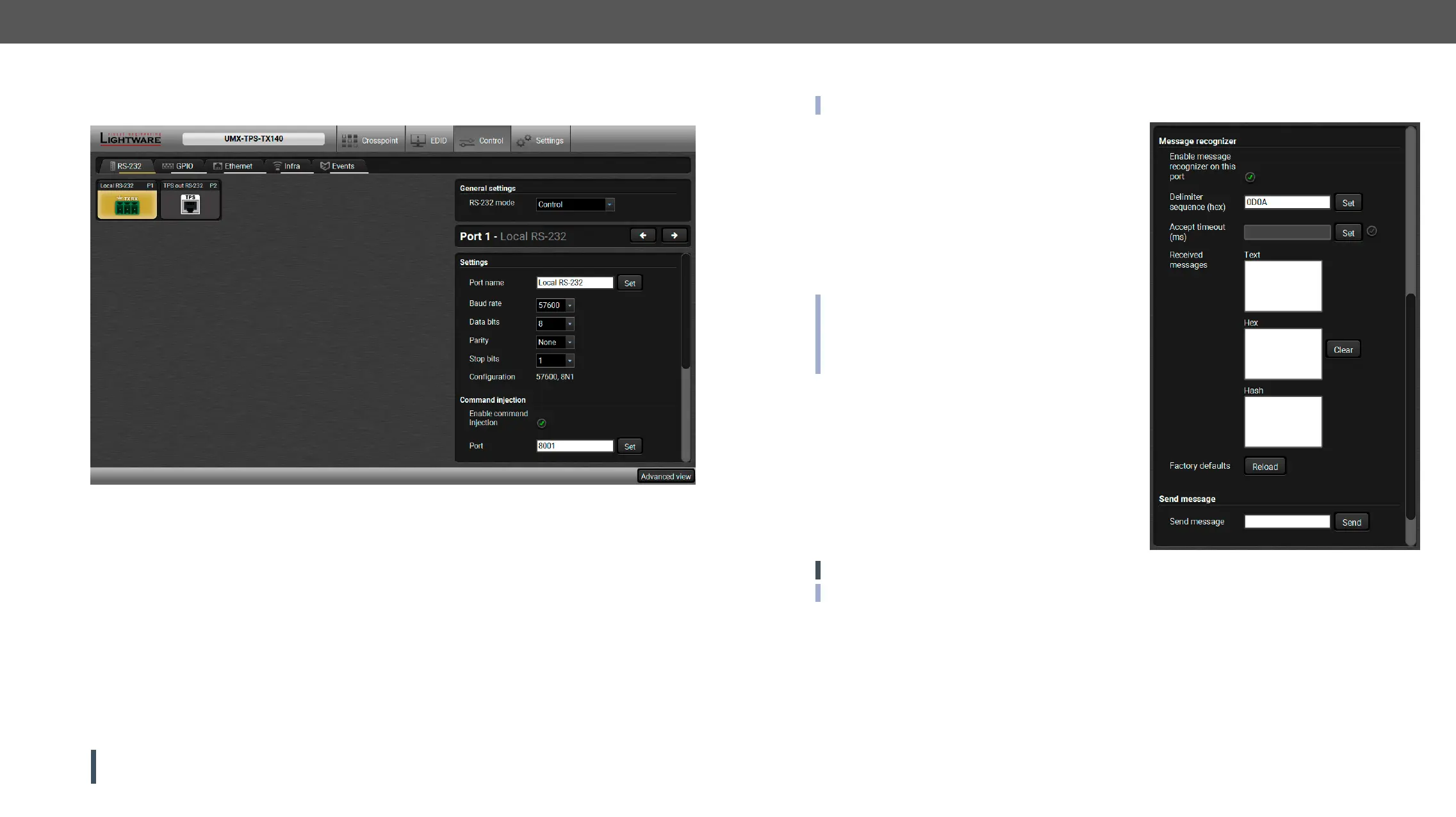 ▪ RS-232 mode: Control, Pass-through, and Command Injection (for more details about serial interface