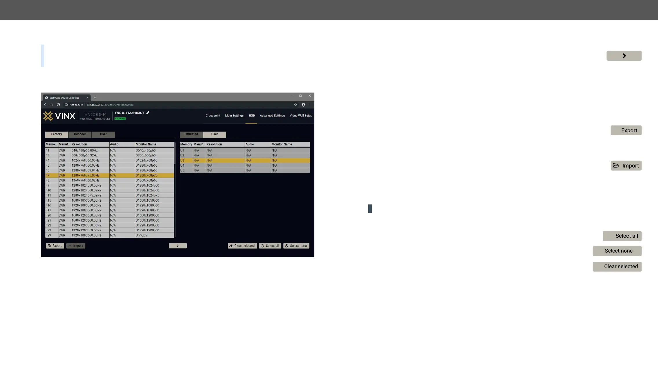 Advanced EDID Management is available in the Encoder. Navigate to the EDID menu. There are two panels: