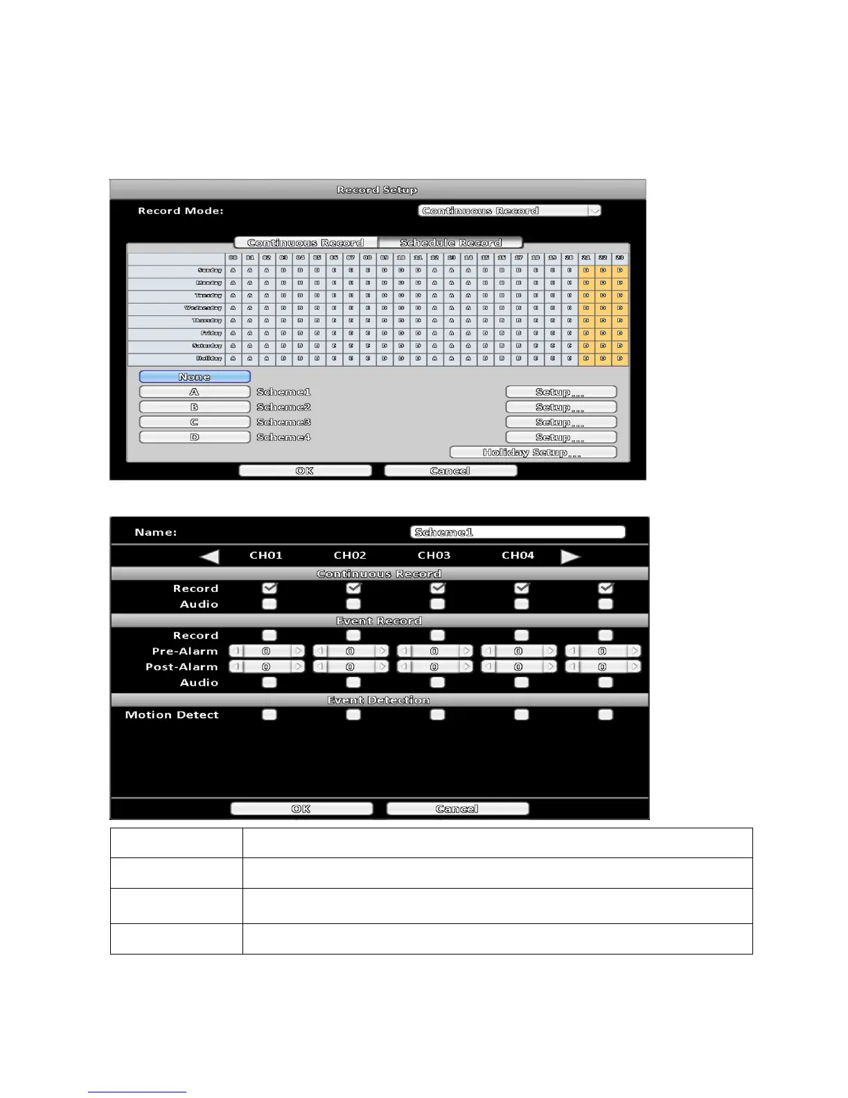Recordings can be scheduled to days and time of a week. With the A, B, C, D four settings, users can set