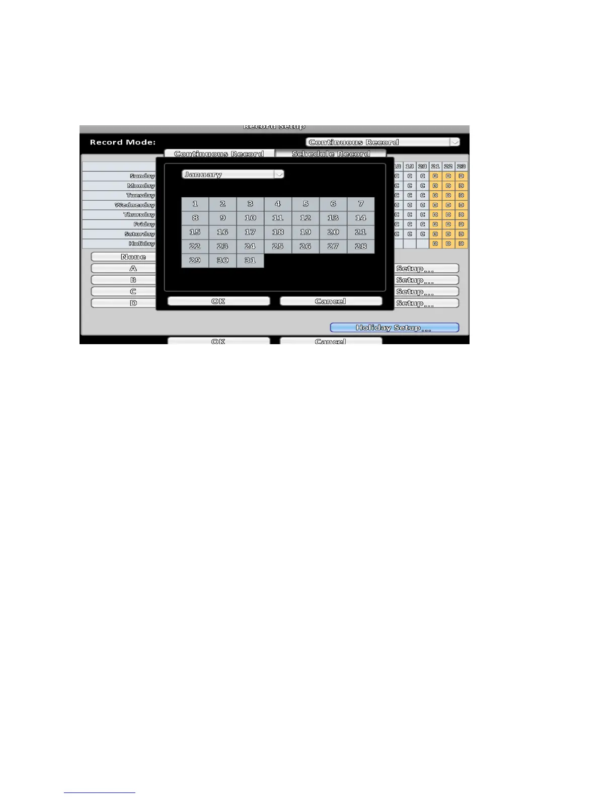 The number of customized holidays is up to 50. When the specified holiday arrives, the DVR will start