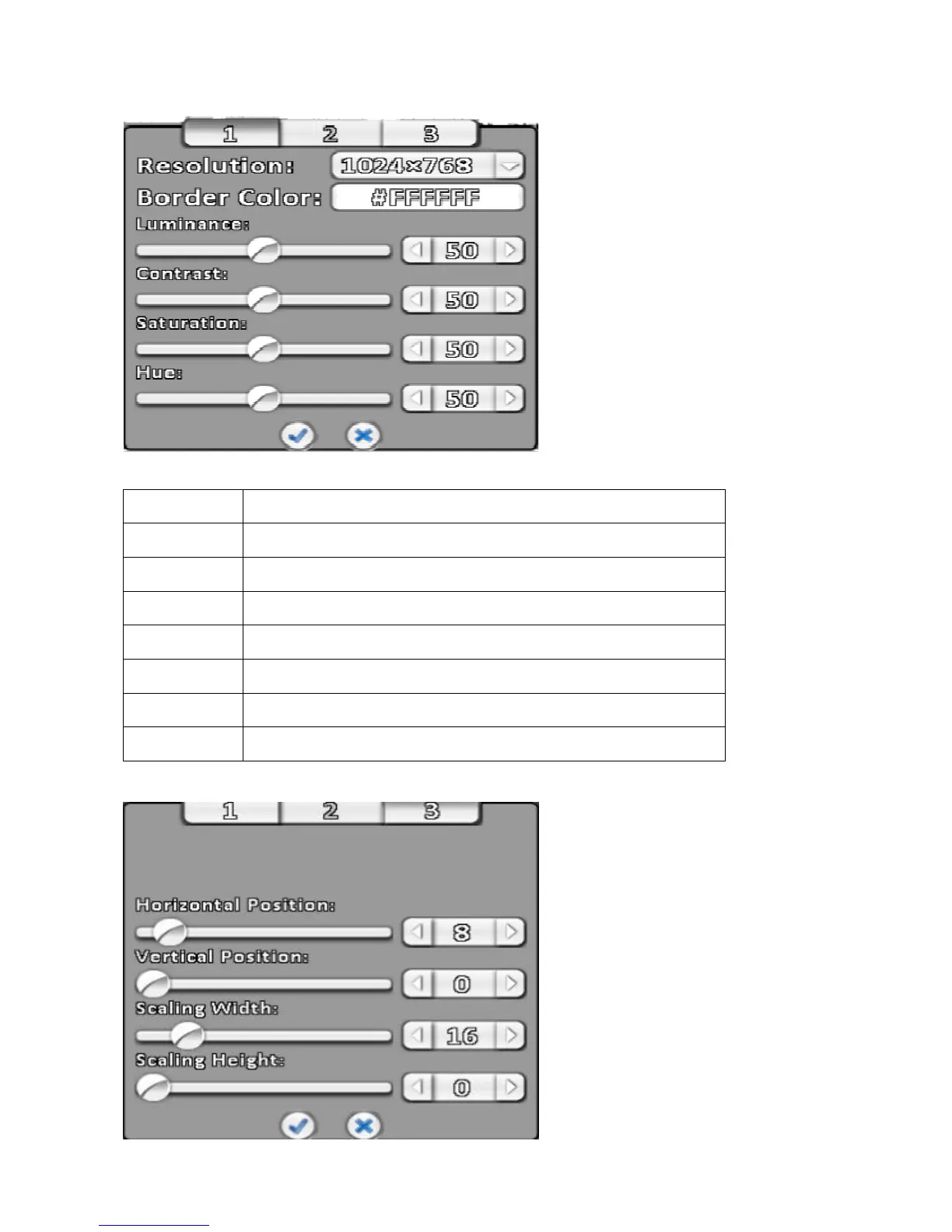 Luminance Setting brightness, from 0 to 100.