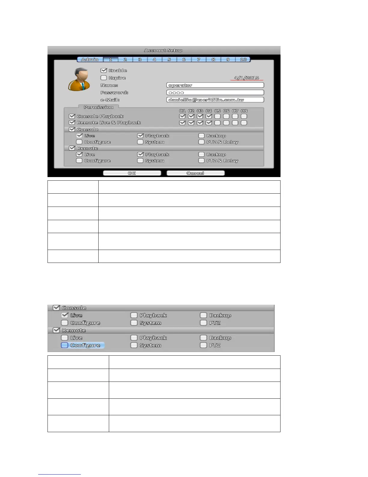 Network operation, PTZ function, Playback, Utility, Backup, Password expiration date and hide on specific