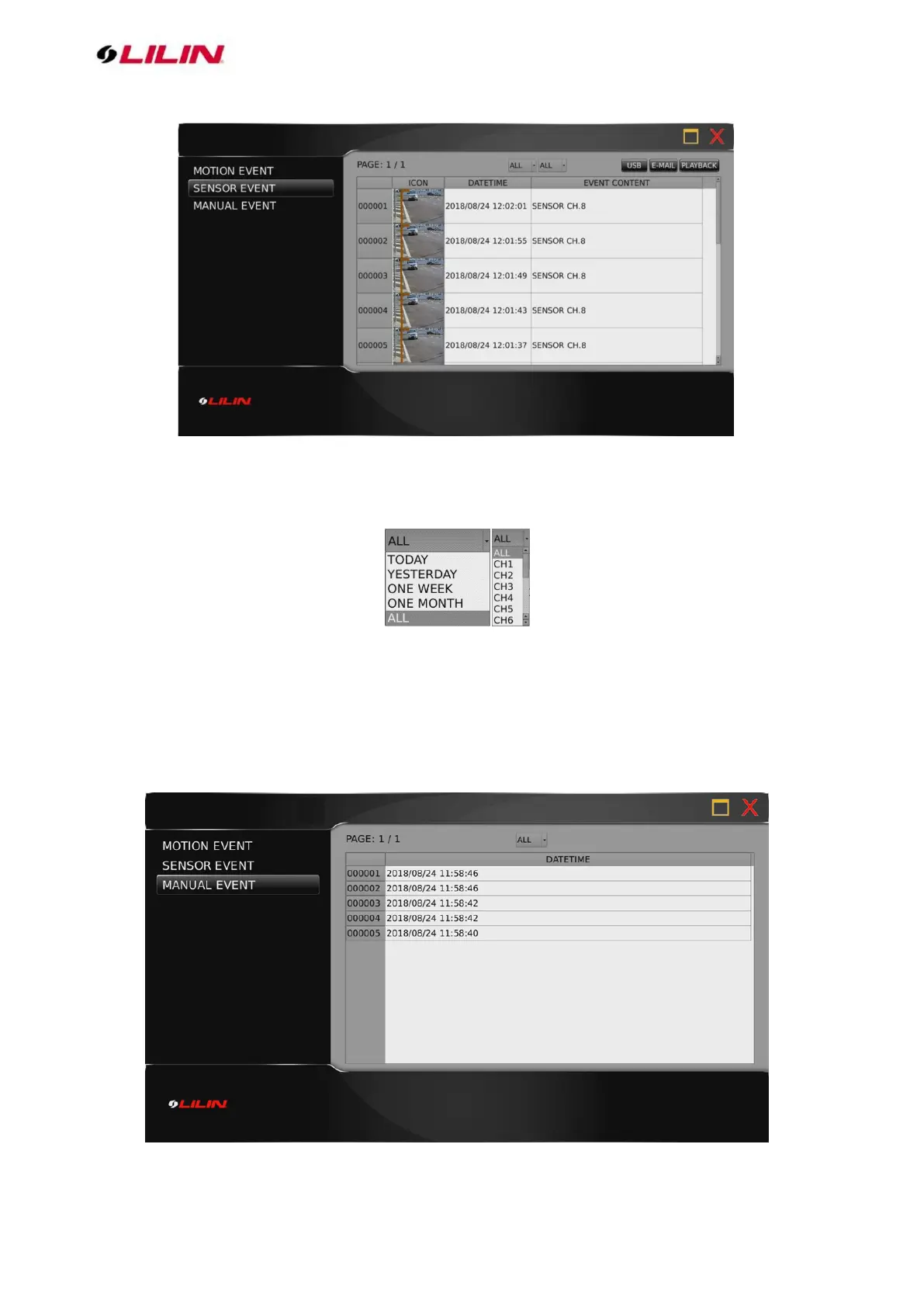 Press the drop-down menu at the top to sort the alarm events by date or channel (as shown in the