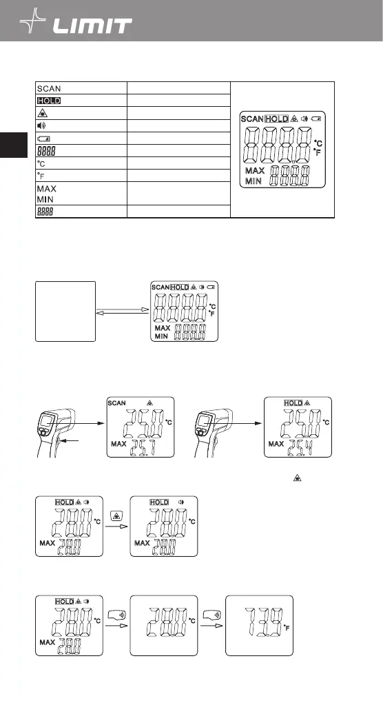 2.2 Släpp upp avtryckaren (SCAN-ikonen försvinner och HOLD-ikonen tänds för att indikera att mätningen