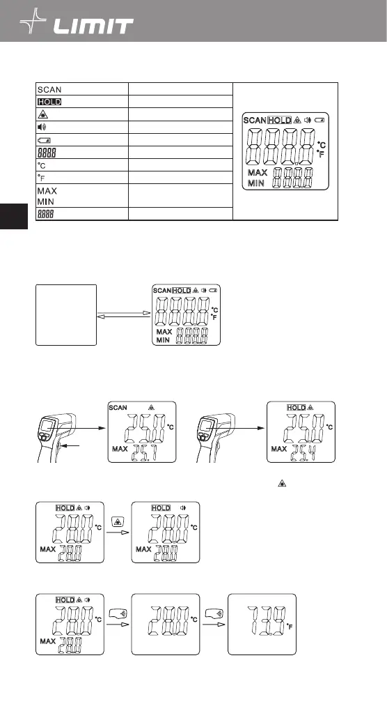 1.1 Tryk på måleudløseren (Pos.1) for at tænde for termometeret. LCD-skærmen (Pos. 5) og baggrundslyset