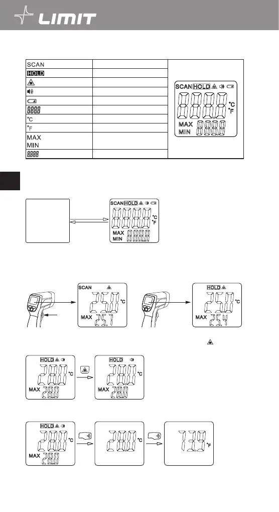 2.1 Suuntaa laite kohteeseen ja paina liipaisin alas. Näytössä syttyy SCAN, joka osoittaa mittauksen olevan