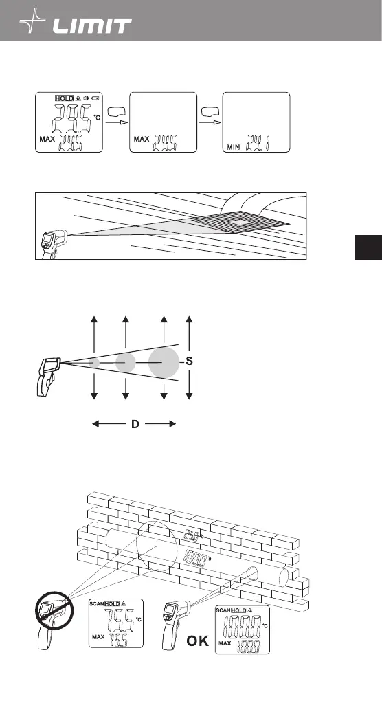 Suuntaa lämpömittari kohdealueelle ja aloita mittaus. Käy koko alue läpi siirtämällä mittauspistettä hitaasti
